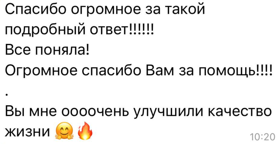 Разложили всё по полочкам и не потребовалось 100500 доп анализов, беганий по врачам. И да, сэкономили наш семейный бюджет на ненужных анализах, на которые в открытую не направляют, но рекомендуют из серии "не лишним будет, оно же не навредит". Да и покупке БАДов, на которых прям настаивали другие специалисты, из серии "жидкий хлорофил" и "черный орех" для нормализации работы ЖКТ и паразитарке (куда тоже пытались нас направить со словами "вашему ребёнку будет не лишним с высыпаниями") ... Спасибо что Вы есть! Спасибо за Ваш труд и внимание! Отдельное спасибо, что Вы продолжате работать в декрете и помогать таким, как я